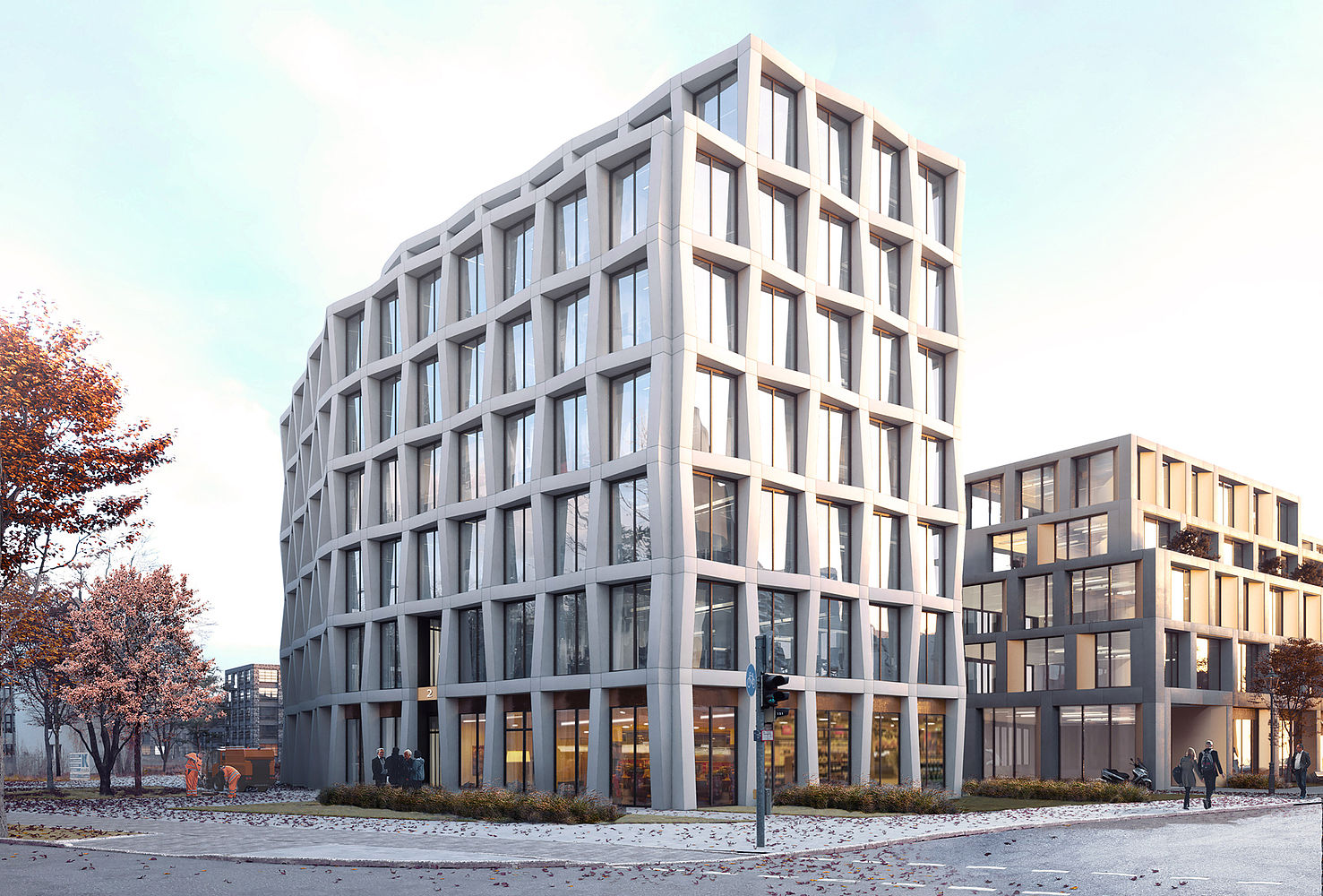 Die Planungsaufgabe besteht aus zwei Gebäudeteilen: dem an der Ecke zur Preussenstraße und der Lerchenauerstraße positionierten punktförmigen und in der Höhe betonten Eckgebäude und einem anschließenden, die Preussenstraße begleitenden flacheren Längsgebäude.
