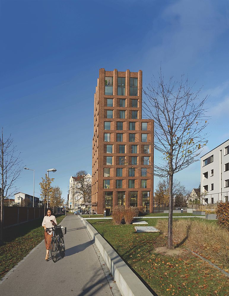 Die Grundform des quadratischen Baukörpers wird durch das Baufeld vorgegeben; in den letzten 4 Geschossen wird durch den Bebauungsplan eine Verjüngung des Turms an der nördlichen und östlichen Fassadeseite zu einem kleineren Quadrat vorgegeben. Der Entwurf nutzt diese Vorgabe und schöpft die zulässige Anzahl von Geschossen aus, um die städtebauliche Dominanz des Quartiersturms zu erhalten.