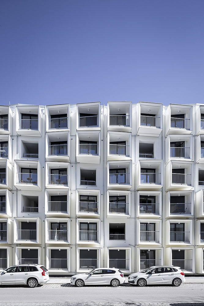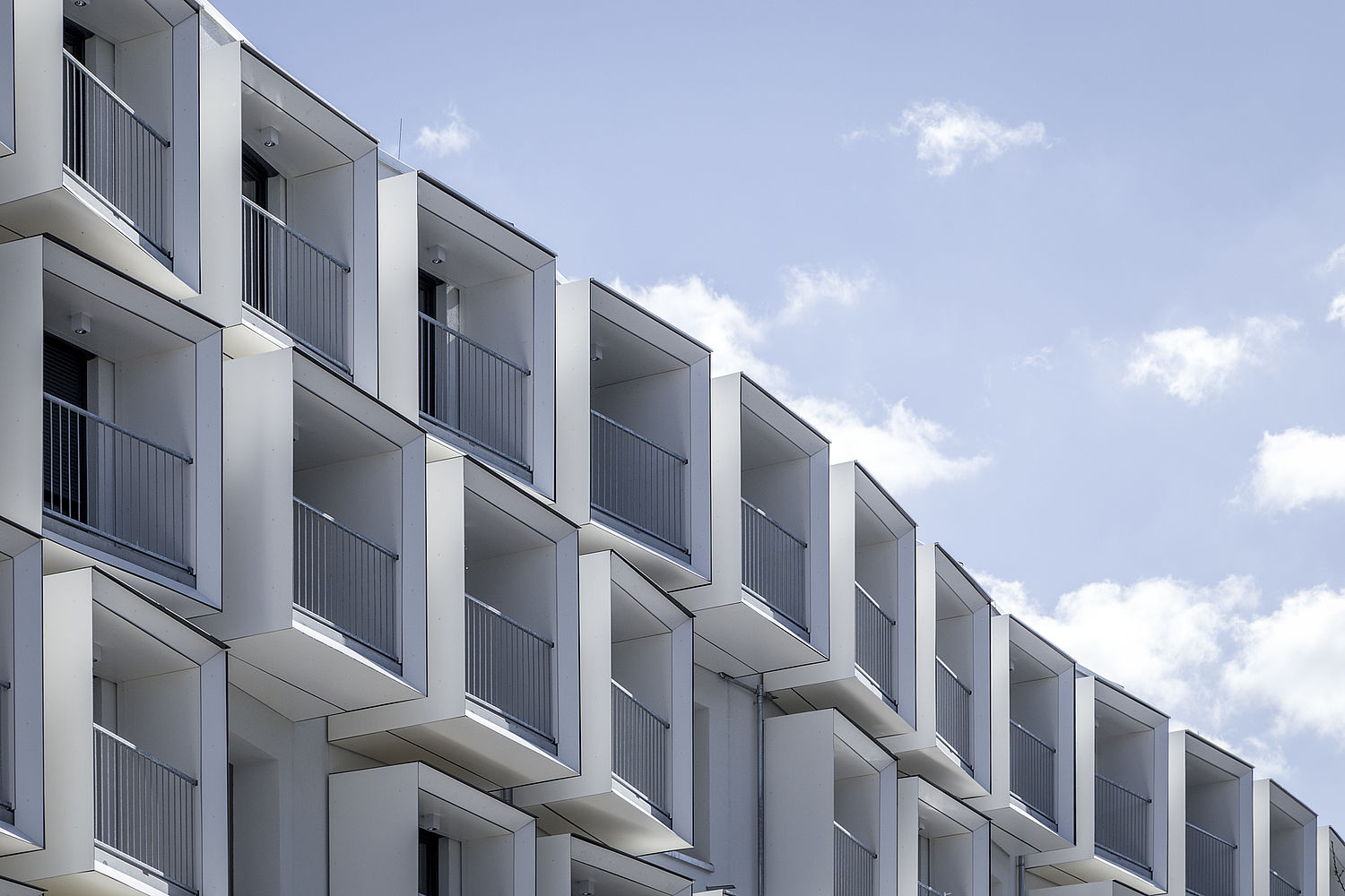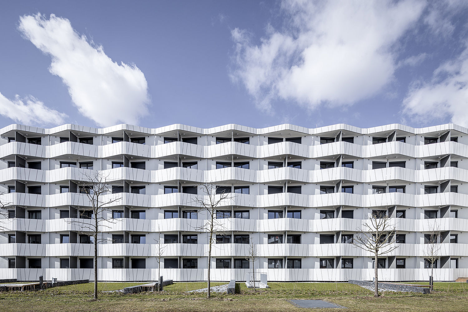 Dem vertikalen Raster der Appartements folgend wird jede 2. Rasterlinie nach hinten gekippt. Die Freisitze der Appartements treten als Volumen vor diese vor- und zurückspringende Fassadenebene. Die Vorderkanten der Balkonvolumen werden ebenfalls mit wechselnden Tiefen ausgebildet, um in der Großform der Fassade in den Geschossen versetzt ein Wellenmotiv zu erzeugen.