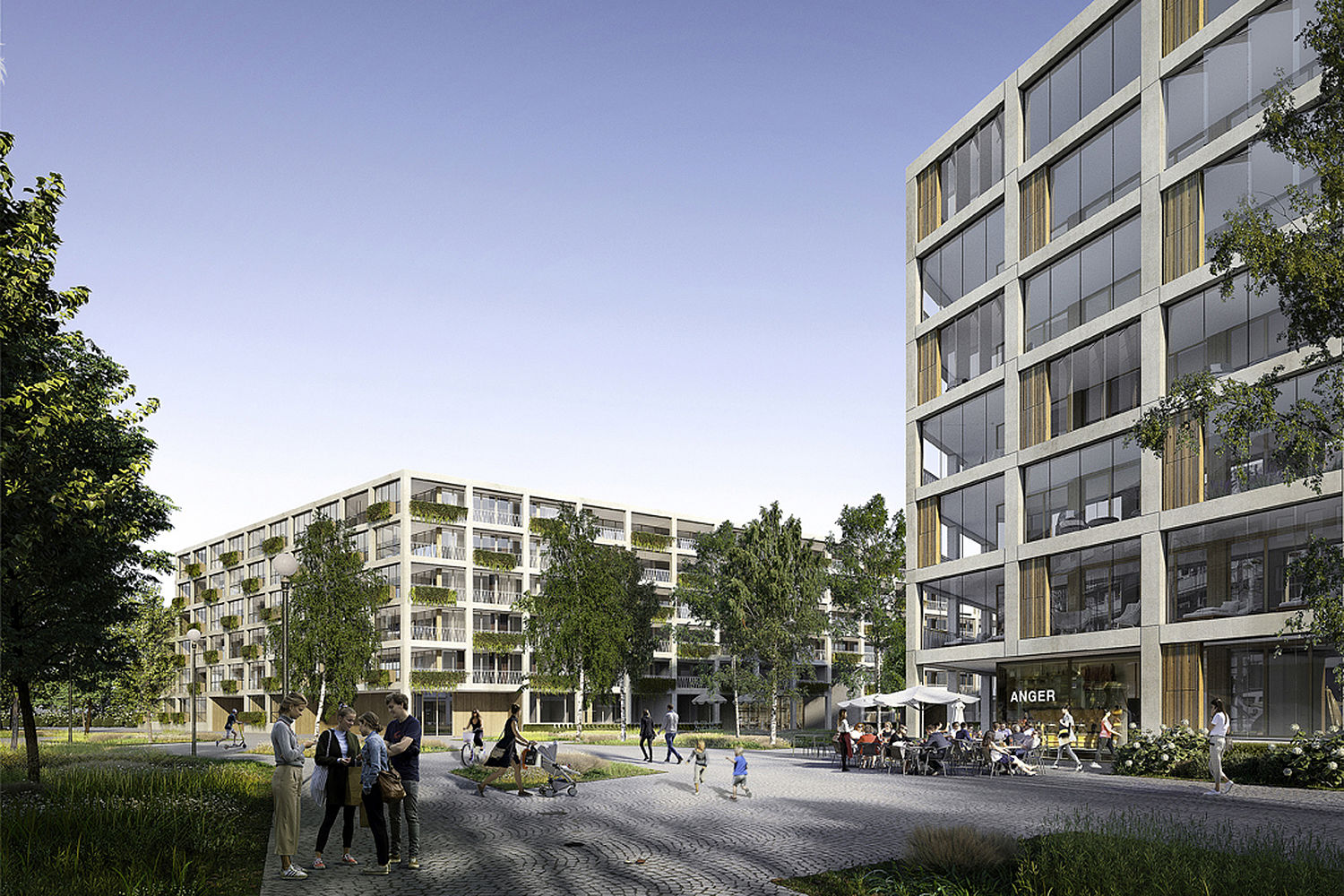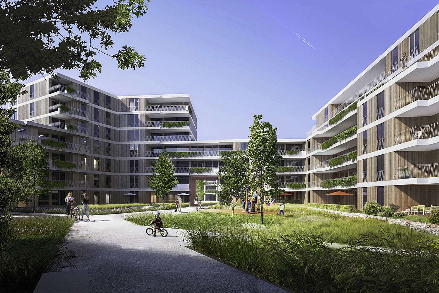 Zur klimatischen Verbesserung des gesamten Wohnumfeldes sind auf den Freisitzen, Terrassen, Balkonen und Loggien an allen Fassaden Begrünungsmöglichkeiten durch Balkon-Pflanzelemente vorgesehen. Die Positionierung der Pflanzelemente folgt einer regelmäßig versetzten Anordnung, um nicht monoton zu wirken. Je Wohnung ist mindestens eine Pflanzmöglichkeit vorgesehen, sofern zwei oder drei Fassadenteilungen je Wohnung vorhanden sind, wechseln sich Pflanzelemente mit bodentiefen Verglasungen ab. Somit entstehen auf den Balkon-Loggien Zonen unterschiedlicher Aufenthaltsqualität: hinter den Pflanzelementen sitzt man geschützt vor Einblicken und hat doch über das Pflanzelement hinweg die Möglichkeit, nach außen zu sehen. Dies schafft willkommene Rückzugsmöglichkeiten.
