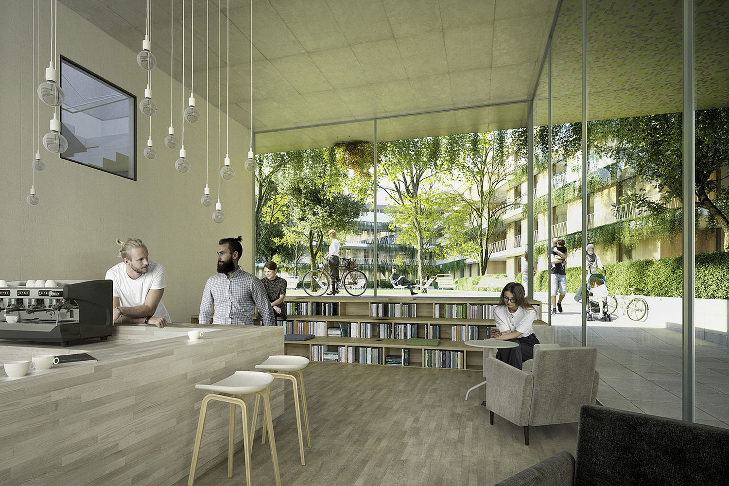 Zur Stärkung der sozialen Bindungen unter den Bewohnern befinden sich weiterhin Gemeinschaftsräume oder gemeinschaftlich genutzte Einrichtungen wie Fahrradreparaturräume nahe den Erschließungskernen. Ihre Positionierung nahe den Durchgängen zu den Höfen fördert die Kommunikation unter den Bewohnern.