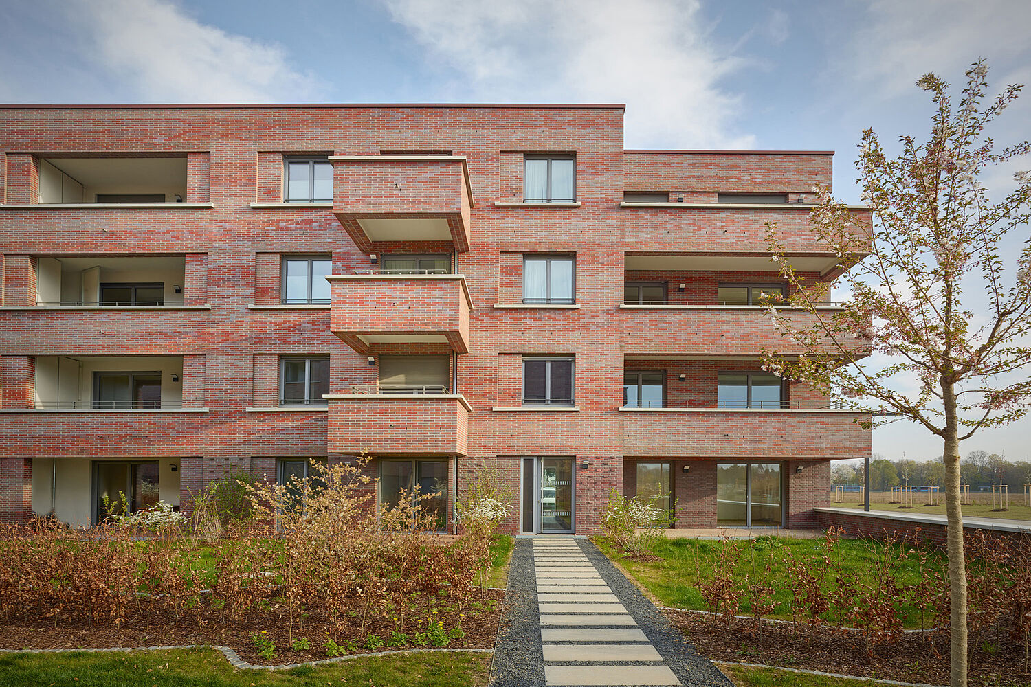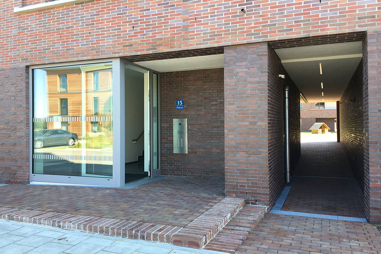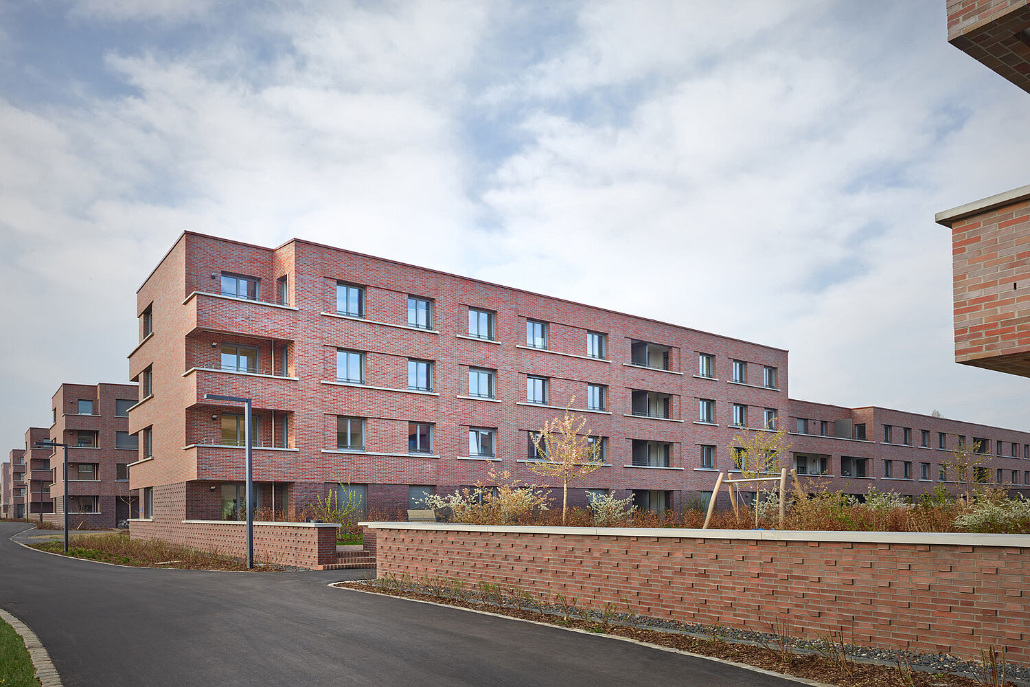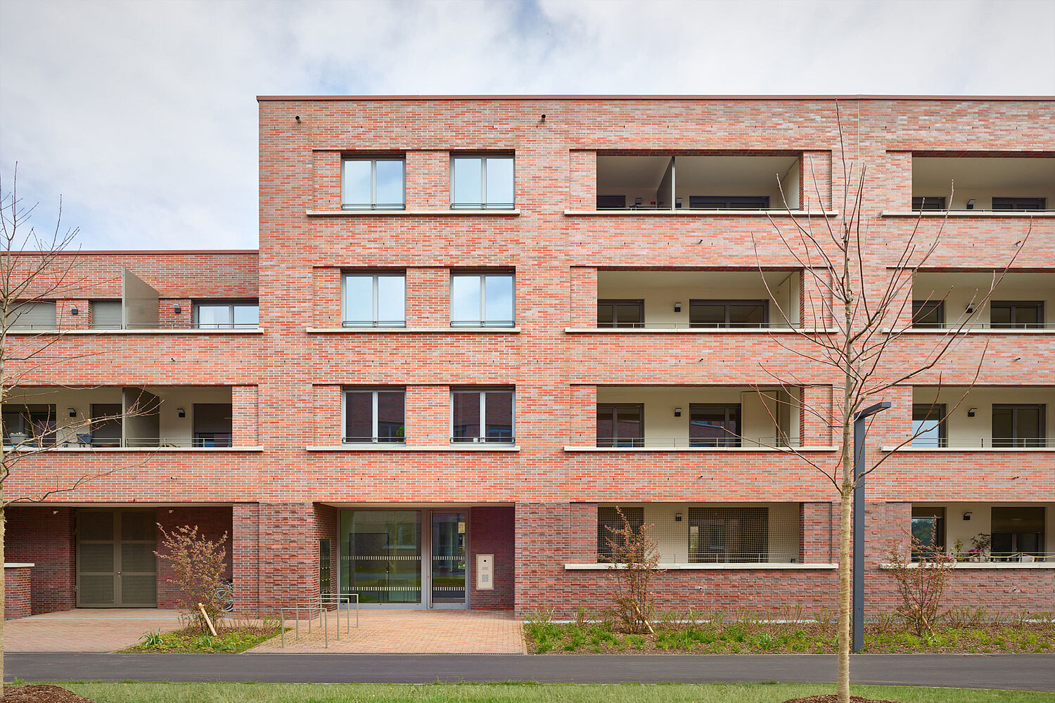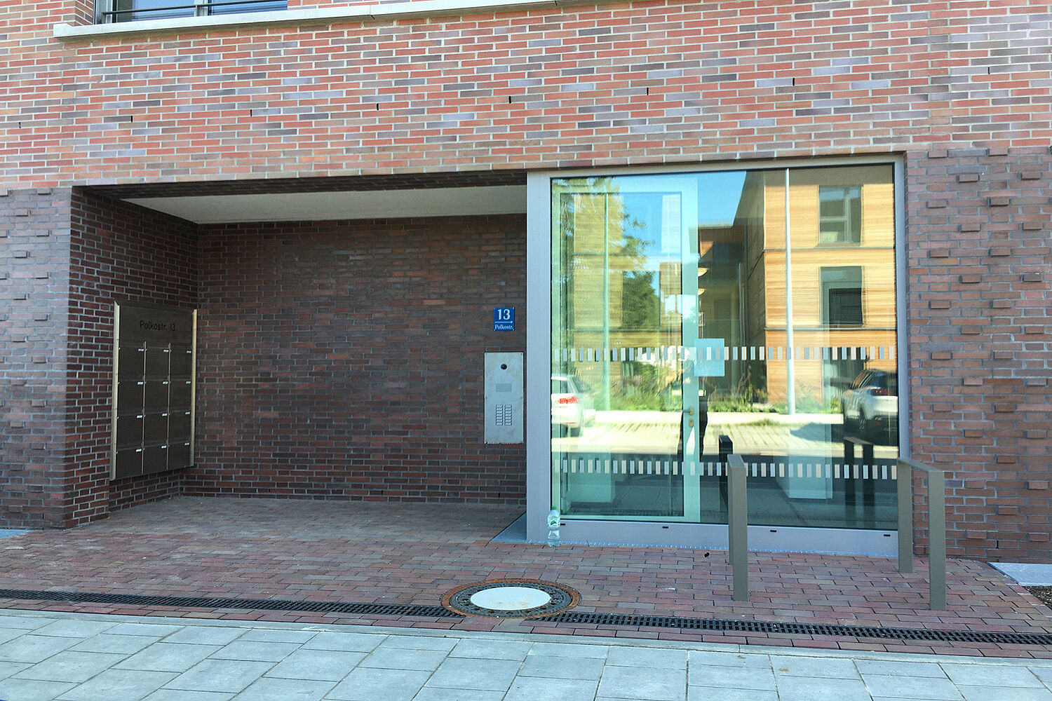 Die Erschließung der Gebäude erfolgt grundsätzlich barrierefrei mit Aufzügen. Den Hauszugängen sind jeweils Abstellmöglichkeiten für Kinderwägen und Mobilitätshilfen zugewiesen, um den unterschiedlichen Bewohnergruppen mit ihren individuellen Bedürfnissen funktional gerecht zu werden.