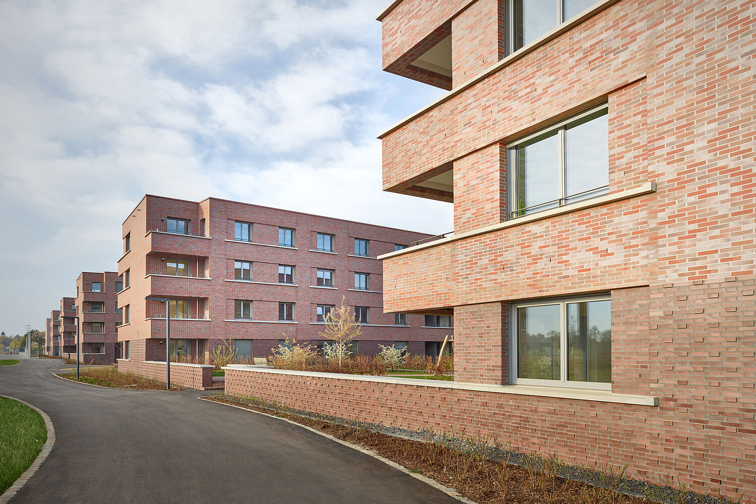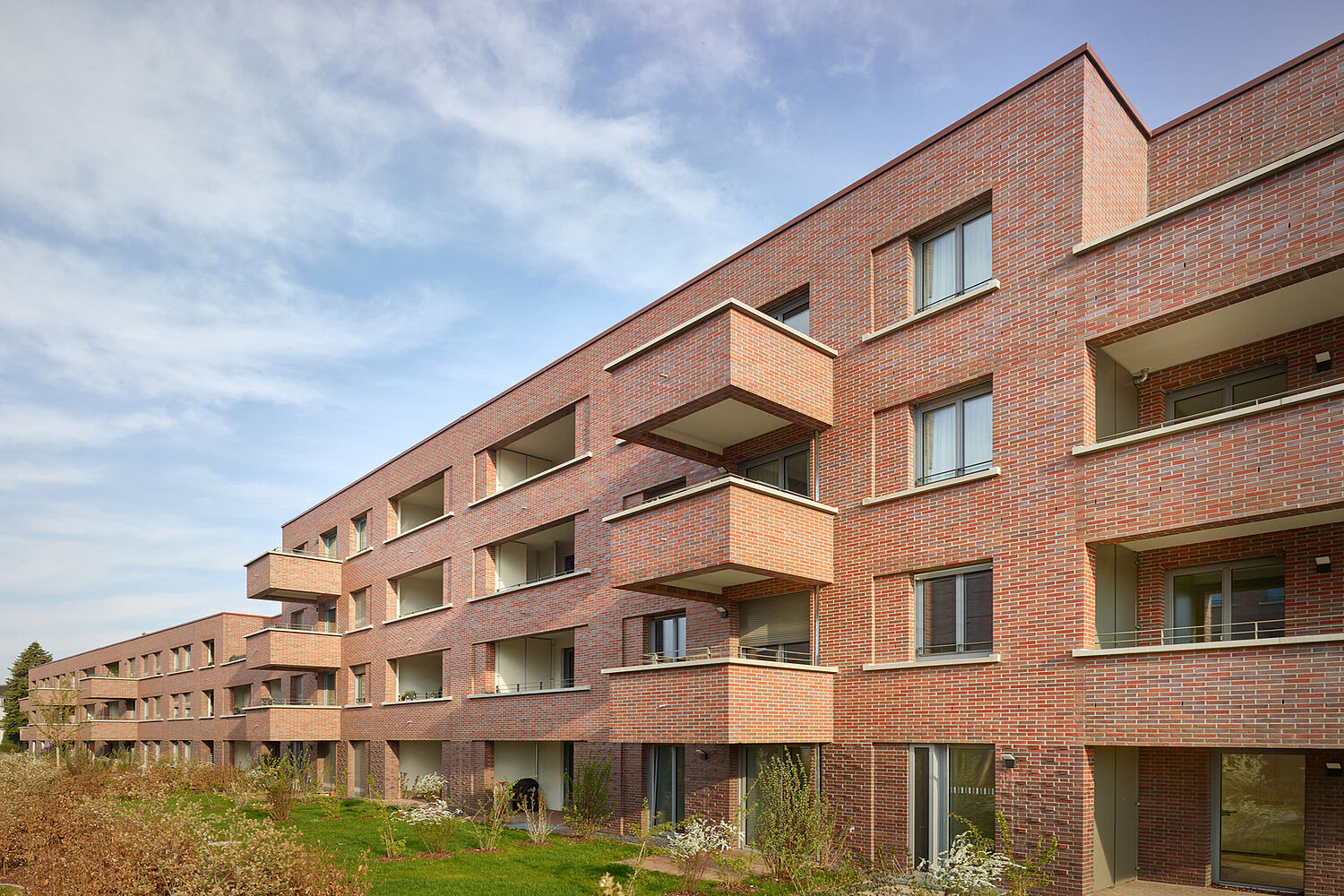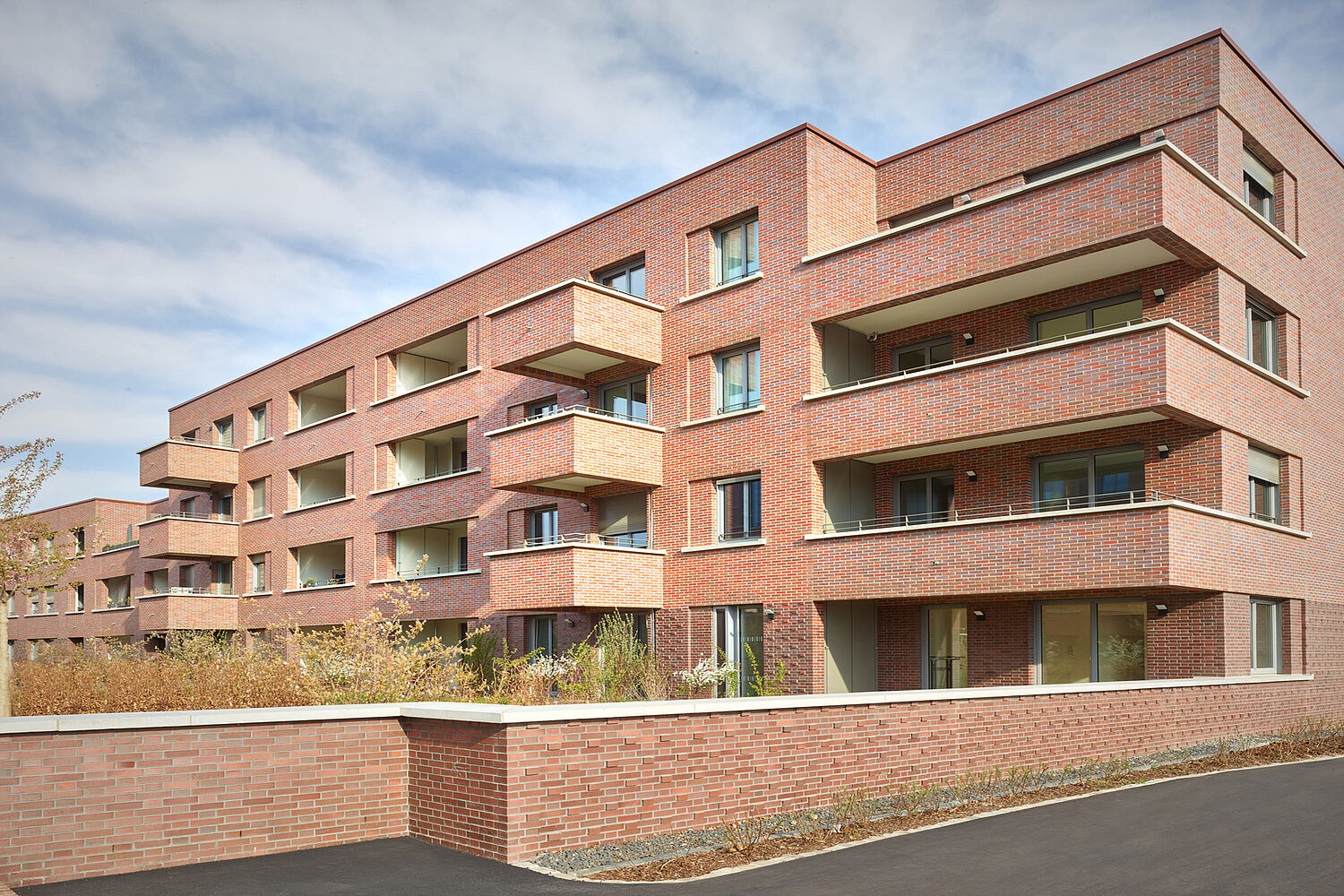 Die Dachlandschaft ist bewusst durch Ausschnitte bewegt, um die Länge der Zeilen neben der Zäsur der Durchgänge und das subtile Knicken der Baukörper zu gliedern. Die Fenster- und Loggienöffnungen prägen als stumpf liegende Formate die Proportionen der Fassaden.