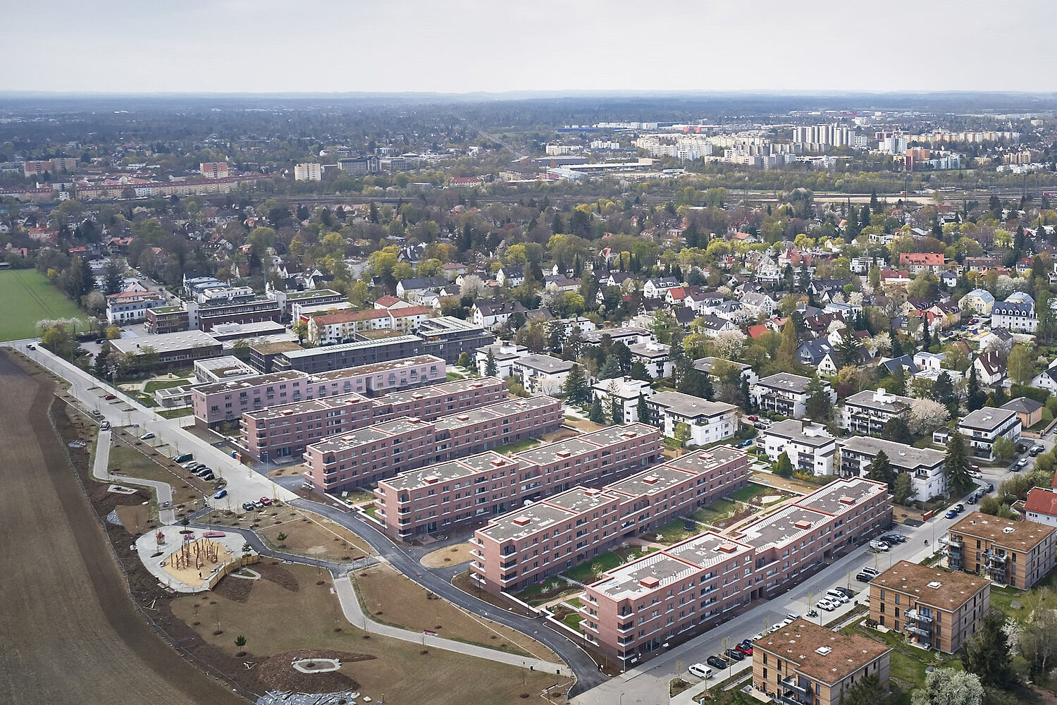 Im Münchner Stadtteil Obermenzing entsteht im Kontext von zwei- bis dreigeschossigen Bestandswohnbauten und landwirtschaftlich genutzten Flächen in unmittelbarer Nähe zur Blutenburg eine neue Wohnbebauung als klassische Stadterweiterung.