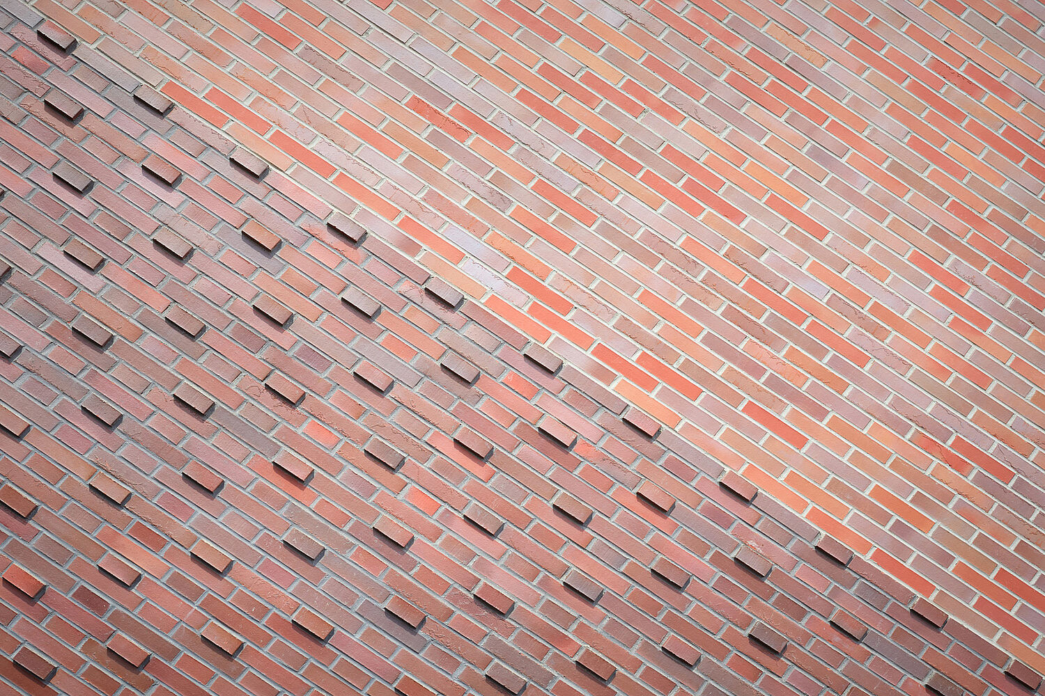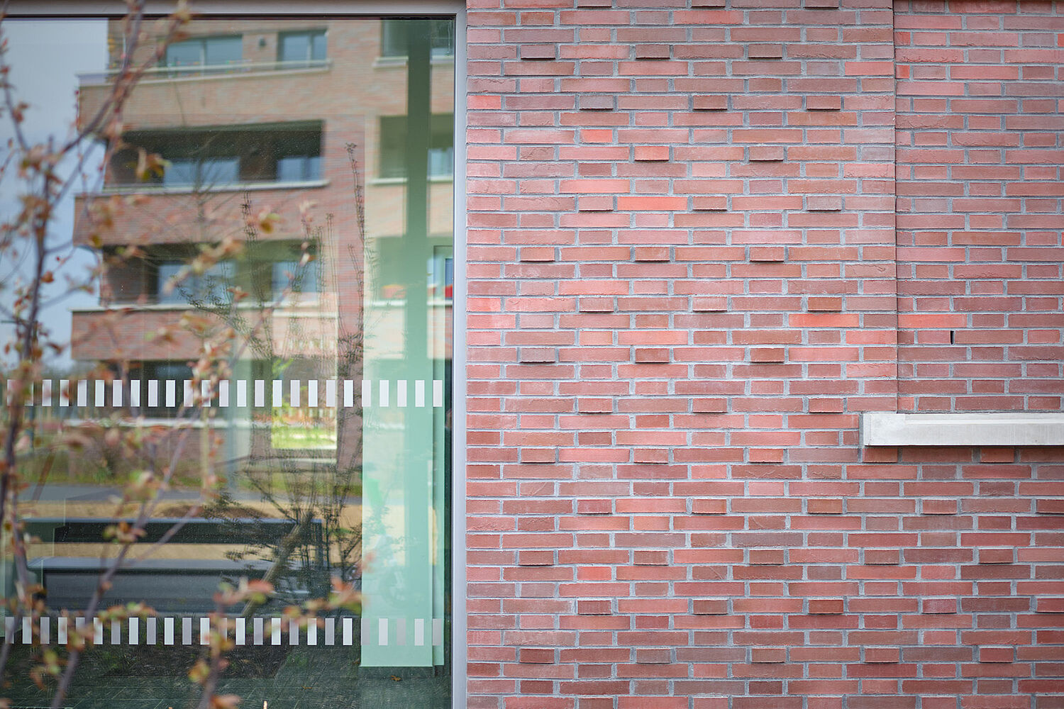 Die zwei verwendeten Klinkerfarben und unterschiedlichen Klinkerverlegemuster proportionieren die Fassade in Sockel und Obergeschosse.